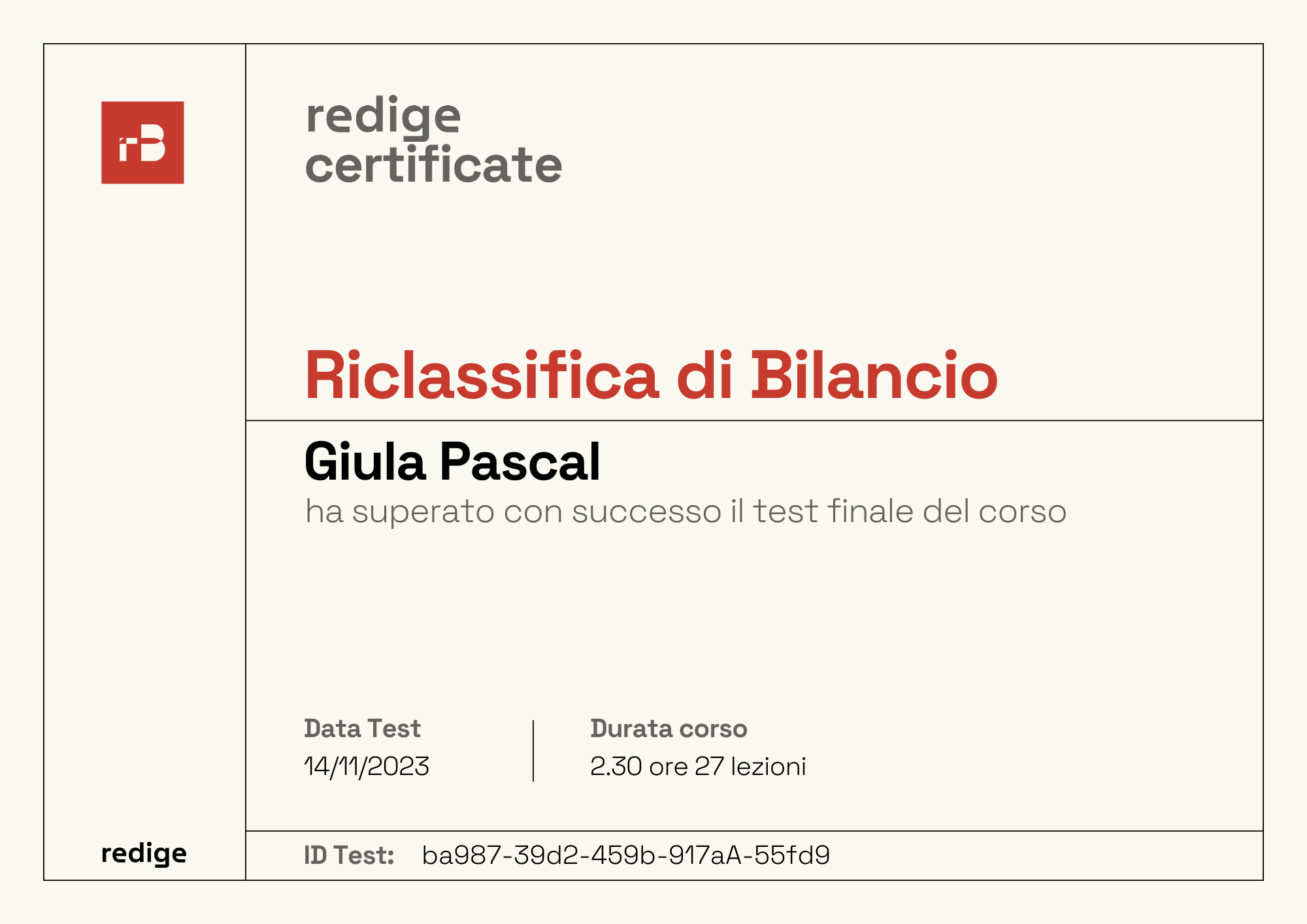 " Corso perfetto per chiunque voglia costruire competenze aziendali o nel mondo dell'analisi finanziaria. Mi rendo conto che la riclassifica di bilancio è uno strumento importantissimo utilizzato in tantissimi cambpi e grazie a redige per averlo spiegato in modo così puntuale ma semplice "